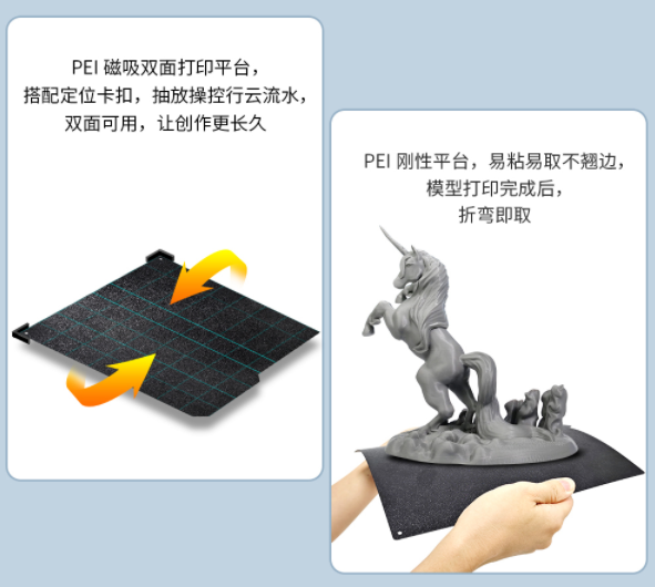 PEI磁吸雙面打印平臺,不僅雙面可用,在打印過程中更是易粘易取不翹邊,內(nèi)置的收納盒設(shè)計,不丟失每一個小細(xì)節(jié)。