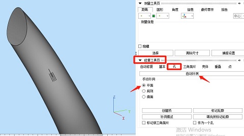 ④使用“修復工具頁”,選擇“孔”,選擇“平面”,對分割后的2個模型都進行自動補洞,也可以根據實際孔洞的起伏形狀來選擇“曲面”或“規則”來補洞。