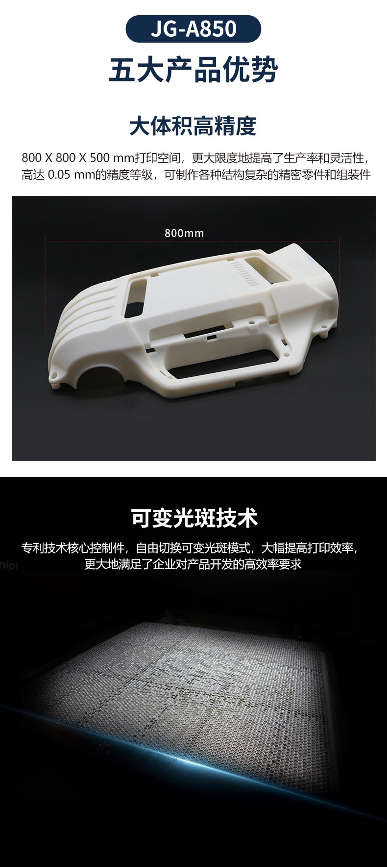 JG-A850 是極光創新自主研發生產的大尺寸工業級3D打印機,擁有800*800*500mm的成型尺寸,可以快速成批量的制做精密零件和組裝件。